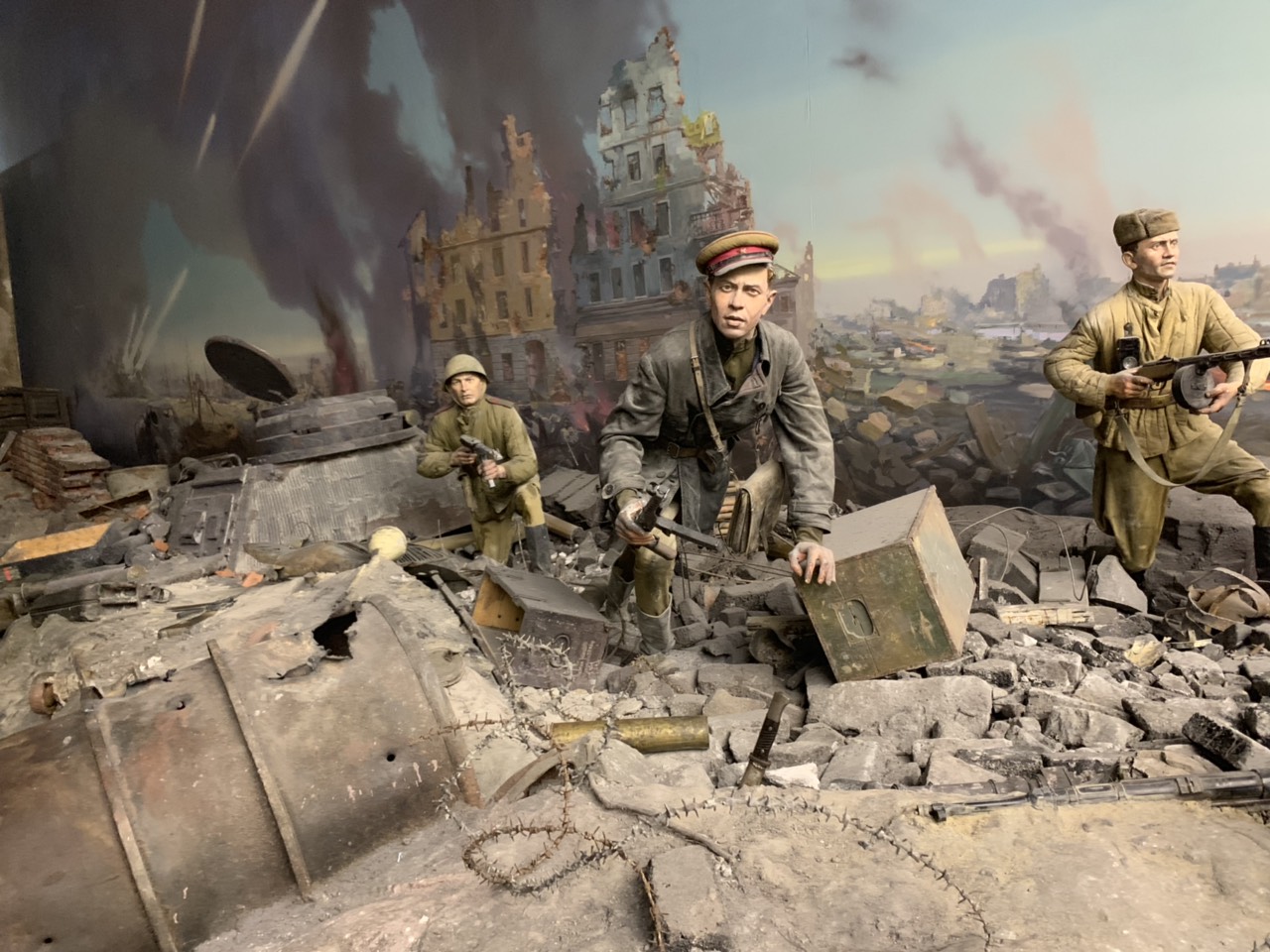 Kinh nghiệm tại Liên bang Nga, nhiều bảo tàng có sự kết hợp của nghệ thuật sắp đặt, hội họa, công nghệ 3D, 4D trở nên sinh động và hấp dẫn người xem. Trong ảnh: Tái hiện cảnh chiến đấu tại Bảo tàng Chiến tranh Vệ quốc, Nga.