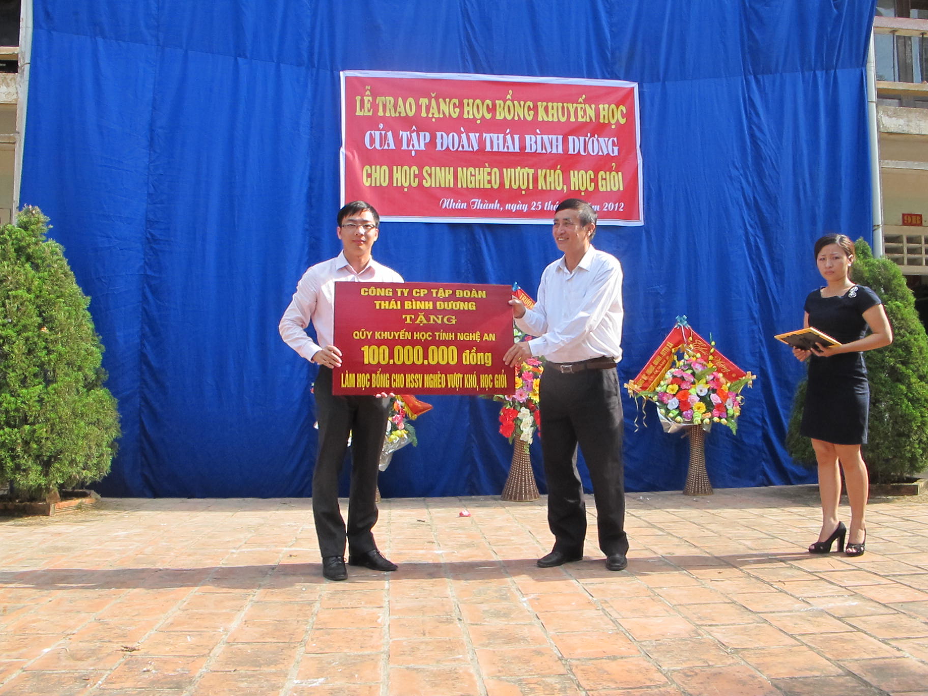 Đồng hành cùng Hội Khuyến học Nghệ An, những năm qua, Tập đoàn Thái Bình Dương đã tài trợ bằng tiền mặt cho Hội 460 triệu đồng và cam kết tài trợ các năm 2013-2015 mỗi năm 100 triệu đồng. Trong năm 2012, Tập đoàn Thái Bình Dương và Hội Khuyến học Nghệ An đã tổ chức trao học bổng cho 220 học sinh nghèo vượt khó từ bậc học mầm non đến Trung học phổ thông trên địa bàn tỉnh Nghệ An, đóng góp tích cực vào kết quả hoạt động của Hội Khuyến học Nghệ An trong năm 2012.