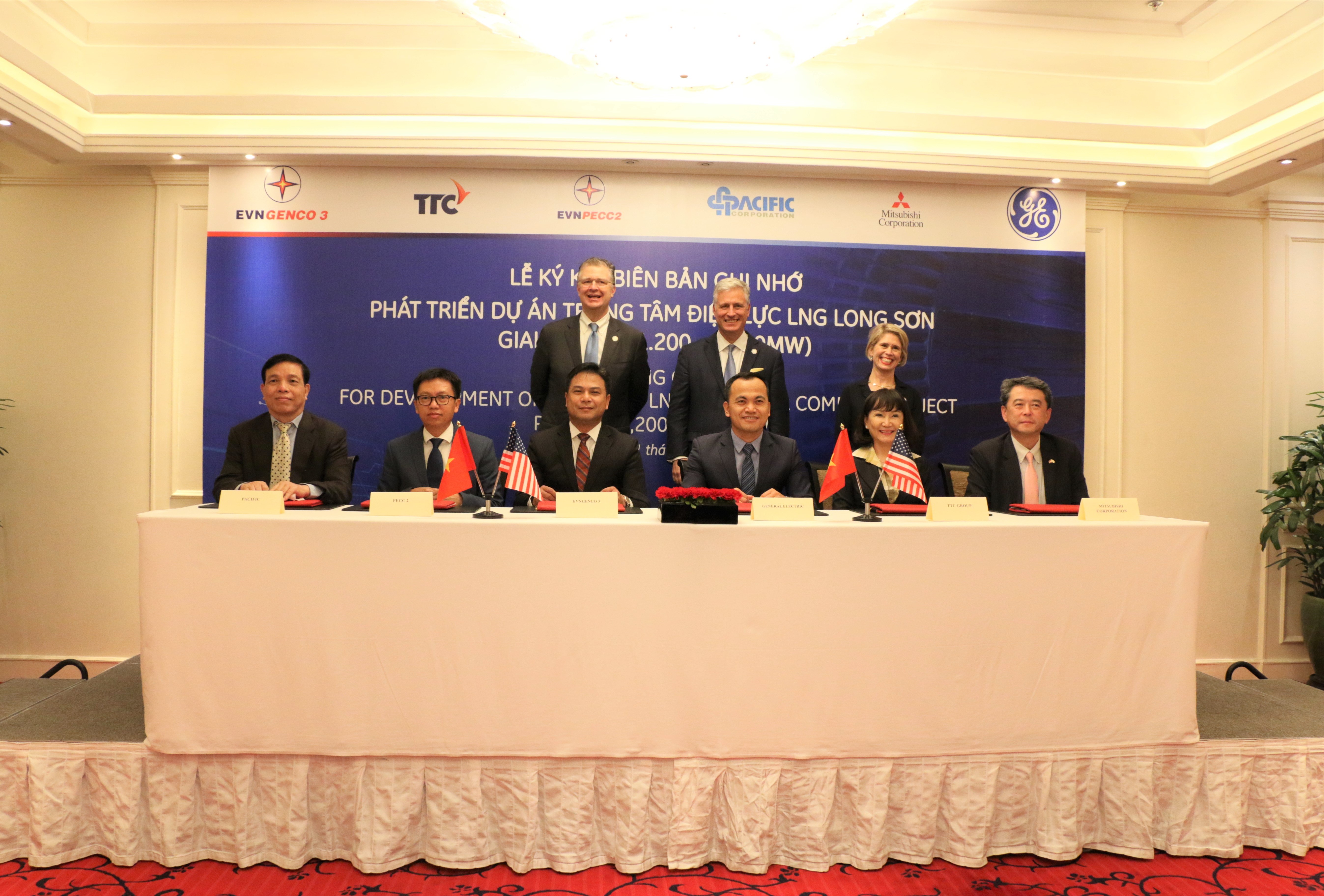 Đại diện các bên tham gia ký kết Biên bản ghi nhớ với sự chứng kiến của Đại sứ quán và Tổng Lãnh sự quán Hoa Kỳ tại Việt Nam (Từ trái sang: (1) Ông Phan Văn Quý - Chủ tịch Tập đoàn Thái Bình Dương, (2) Ông Nguyễn Chơn Hùng - Chủ tịch HĐQT Công ty cổ phầnTư vấn Xây dựng Điện 2, (3) Ông Đinh Quốc Lâm - Chủ tịch HĐQT Tổng Công ty Phát điện 3,
