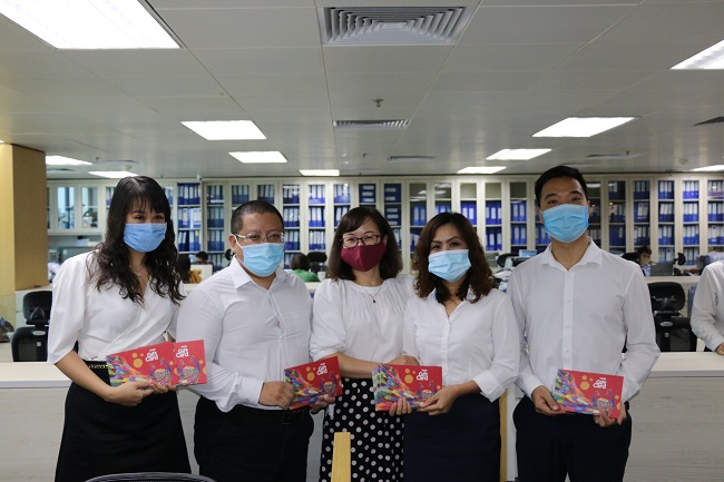 Chị Nguyễn Thị Toàn, Chủ tịch Công đoàn (người thứ hai, từ phải qua) thay mặt Ban lãnh đạo, tới từng phòng/ ban tặng quà cho các bậc phụ huynh