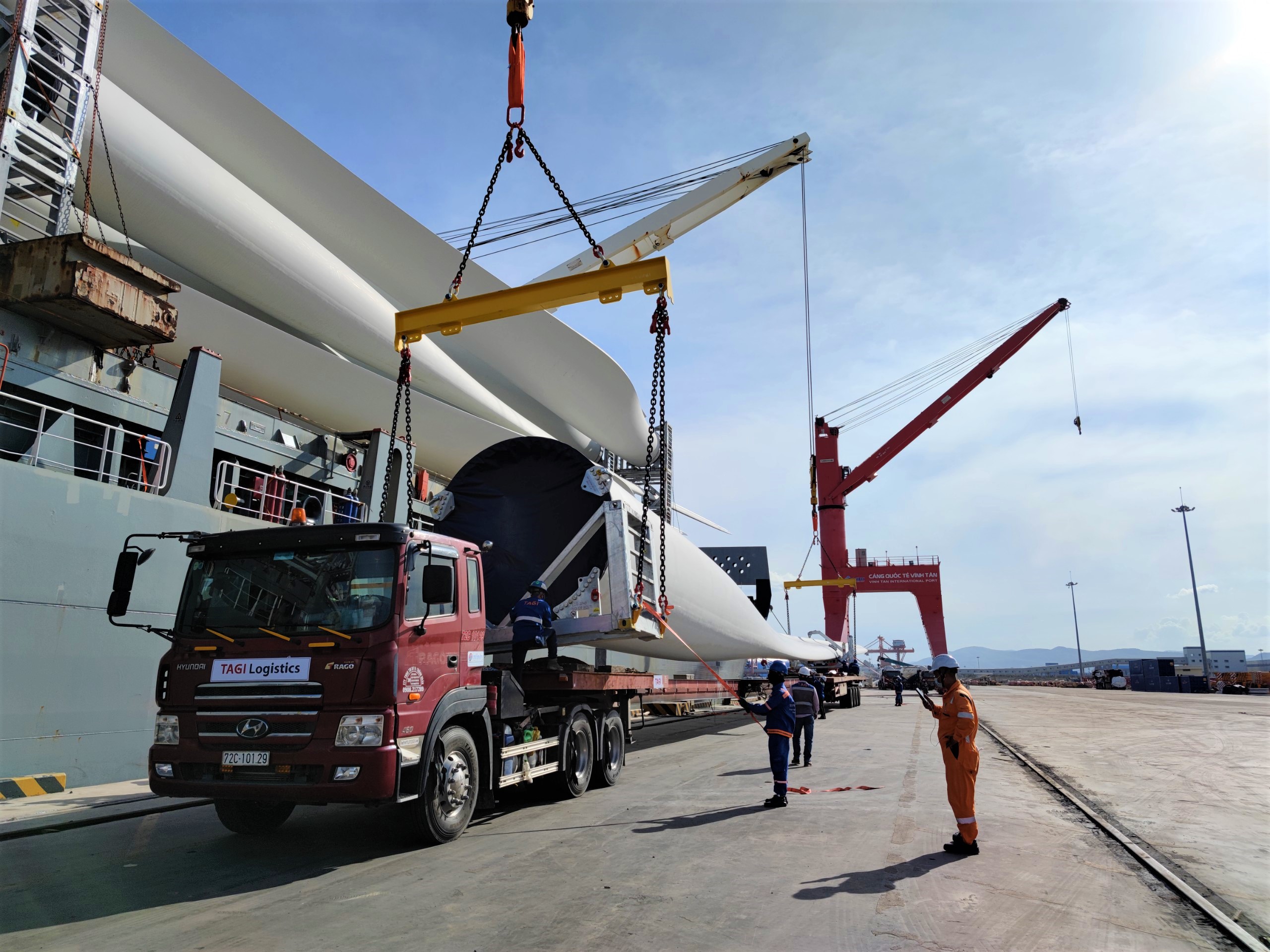 Chuyến hàng bao gồm 9 bộ trụ kèm tuabin và hệ thống cánh quạt đã được bốc dỡ lên bờ an toàn và sẽ được vận chuyển về công trường đảm bảo tiến độ chung của dự án.
