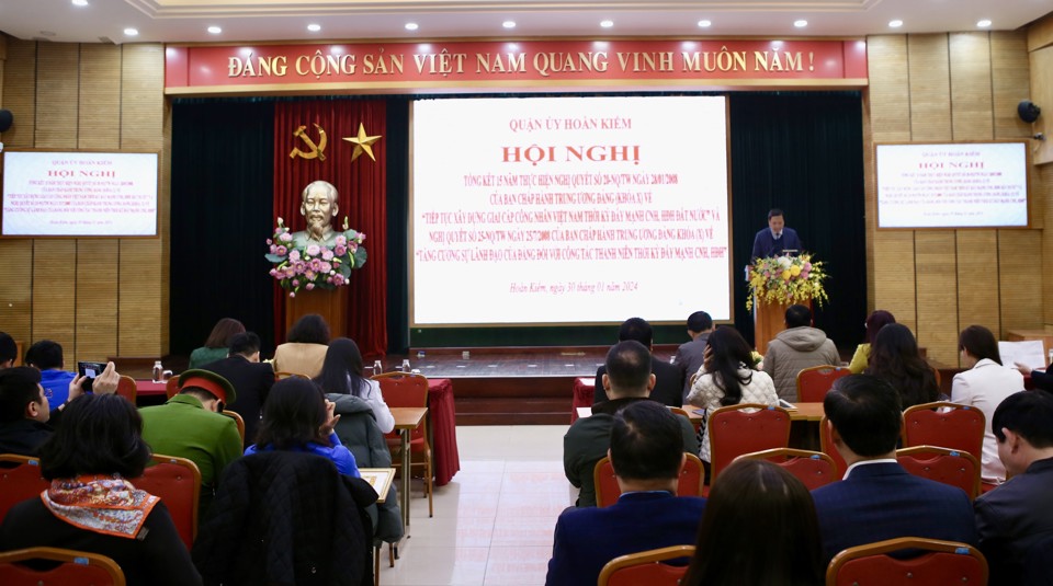 Sáng 30/1/2024, Quận ủy Hoàn Kiếm tổ chức Hội nghị tổng kết 15 năm thực hiện Nghị quyết số 20-NQ/TW ngày 28/1/2008 của Ban Chấp hành Trung ương Đảng về “Tiếp tục xây dựng giai cấp công nhân Việt Nam thời kỳ đẩy mạnh công nghiệp hóa, hiện đại hóa đất nước” và tổng kết 15 năm thực hiện Nghị quyết số 25-NQ/TW ngày 25/7/2008 của Ban Chấp hành Trung ương Đảng về “Tăng cường sự lãnh đạo của Đảng đối với công tác thanh niên thời kỳ đẩy mạnh công nghiệp hóa, hiện đại hóa”.