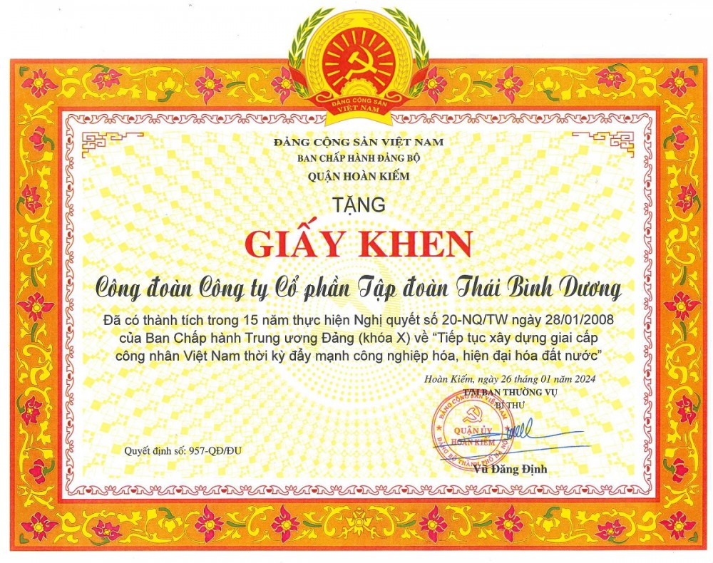 Giấy khen của Quận ủy Hoàn Kiếm tặng thưởng cho Công đoàn Tập đoàn Thái Bình Dương