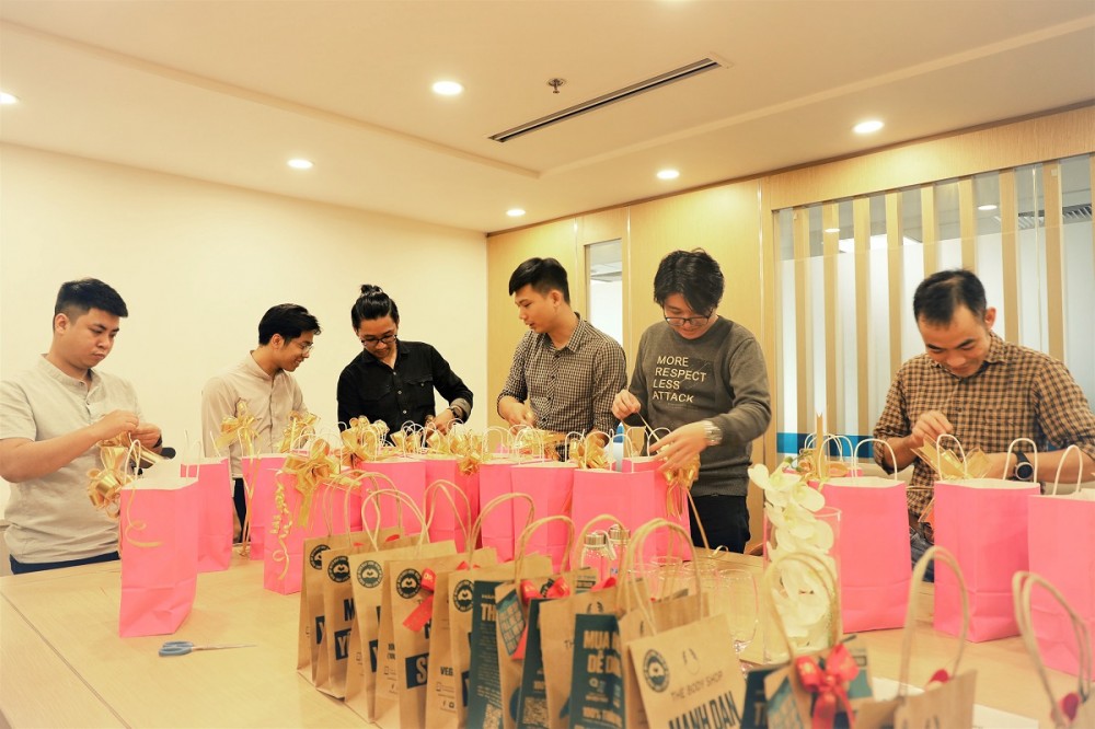 Anh em cặm cụi chuẩn bị những món quà dành tặng chị em.