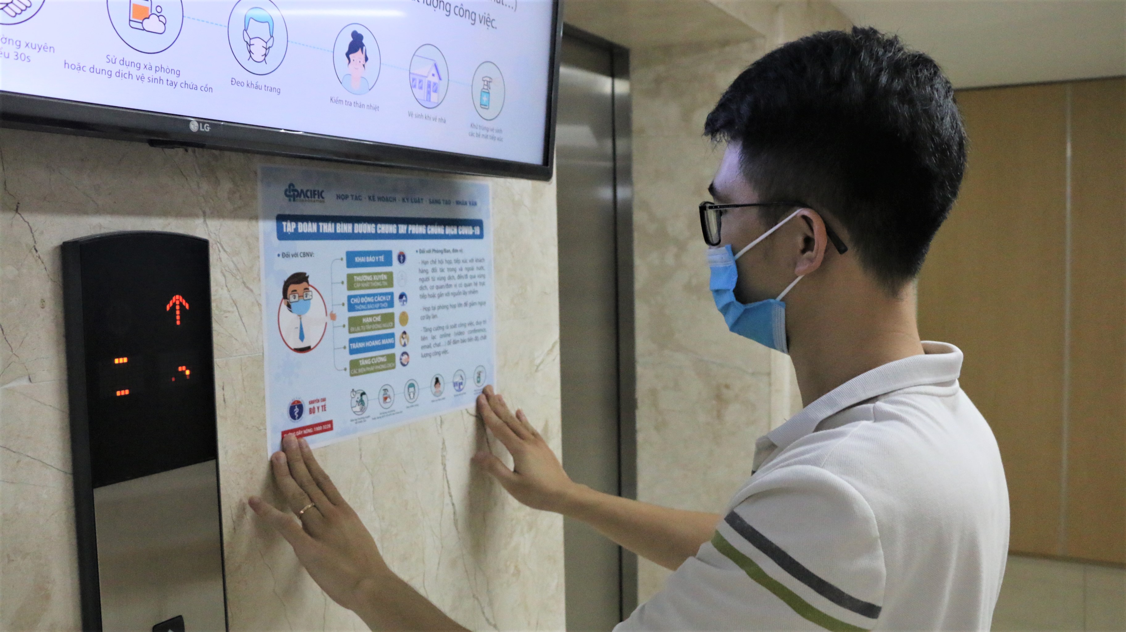 Poster thông báo các biện pháp phòng, chống dịch Covid-19 được dán tại các vị trí dễ nhận thấy tại văn phòng