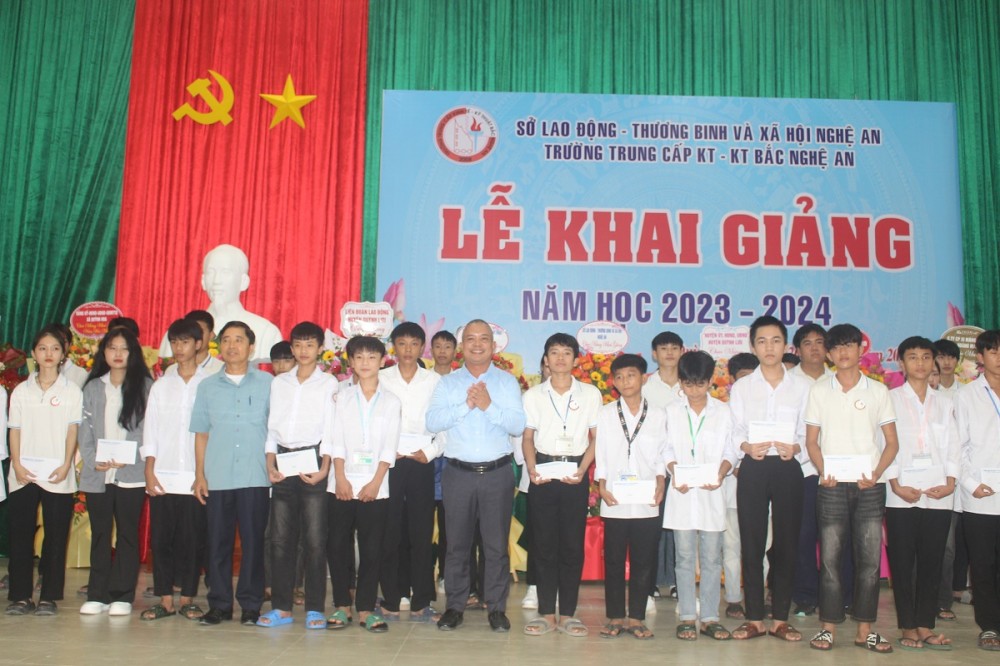 Chiều ngày 26/10, Trường Trung cấp Kinh tế- Kỹ thuật Bắc Nghệ An (đóng tại huyện Quỳnh Lưu) đã tổ chức Lễ khai giảng năm học mới 2023 – 2024. Nhân dịp này, đại diện Tập đoàn Thái Bình Dương đã trao 35 suất học bổng cho các em học sinh vượt khó học giỏi, mỗi suất học bổng trị giá 500 ngàn đồng.