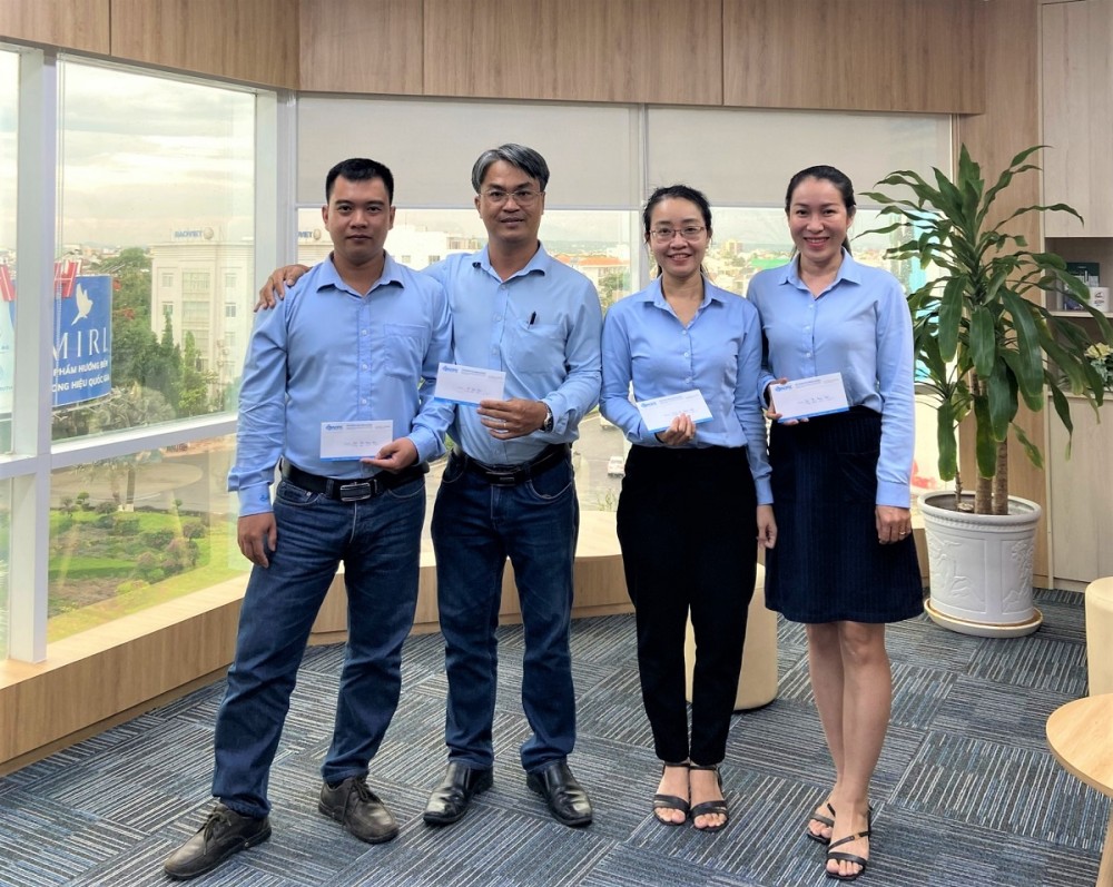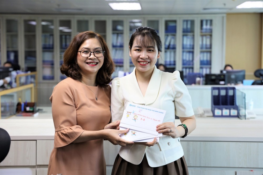 Chị Nguyễn Thị Toàn, Chủ tịch Công đoàn thay mặt Ban lãnh đạo tặng quà 1/6 cho từng phòng/ ban