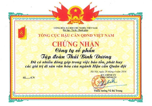 Tập đoàn Thái Bình Dương vinh dự nhận Giấy chứng nhận của Tổng cục hậu cần QĐND Việt Nam.