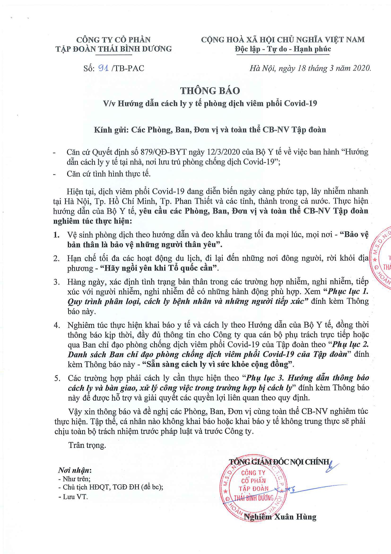 Hiện tại, dịch viêm phổi Covid-19 đang diễn biến ngày càng phức tạp, lây nhiễm nhanh tại Hà Nội và các tỉnh, thành trong cả nước. Tập đoàn Thái Bình Dương đã ra Thông báo số 91/TB-PAC về việc Hướng dẫn cách ly y tế phòng dịch viêm phổi Covid-19.