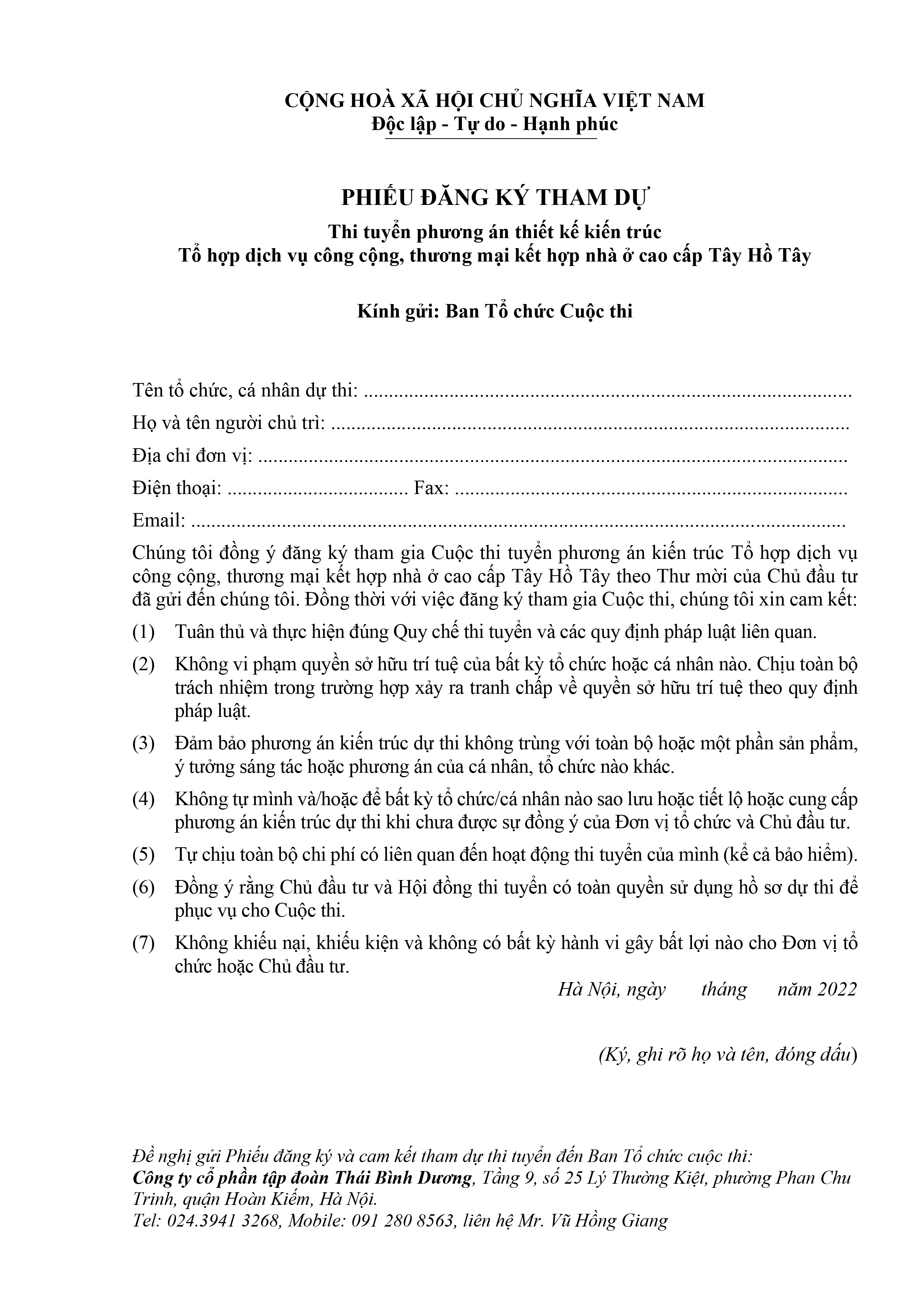 - Đồng ý rằng Chủ đầu tư và Hội đồng thi tuyển có toàn quyền sử dụng hồ sơ dự thi để phục vụ cho Cuộc thi.