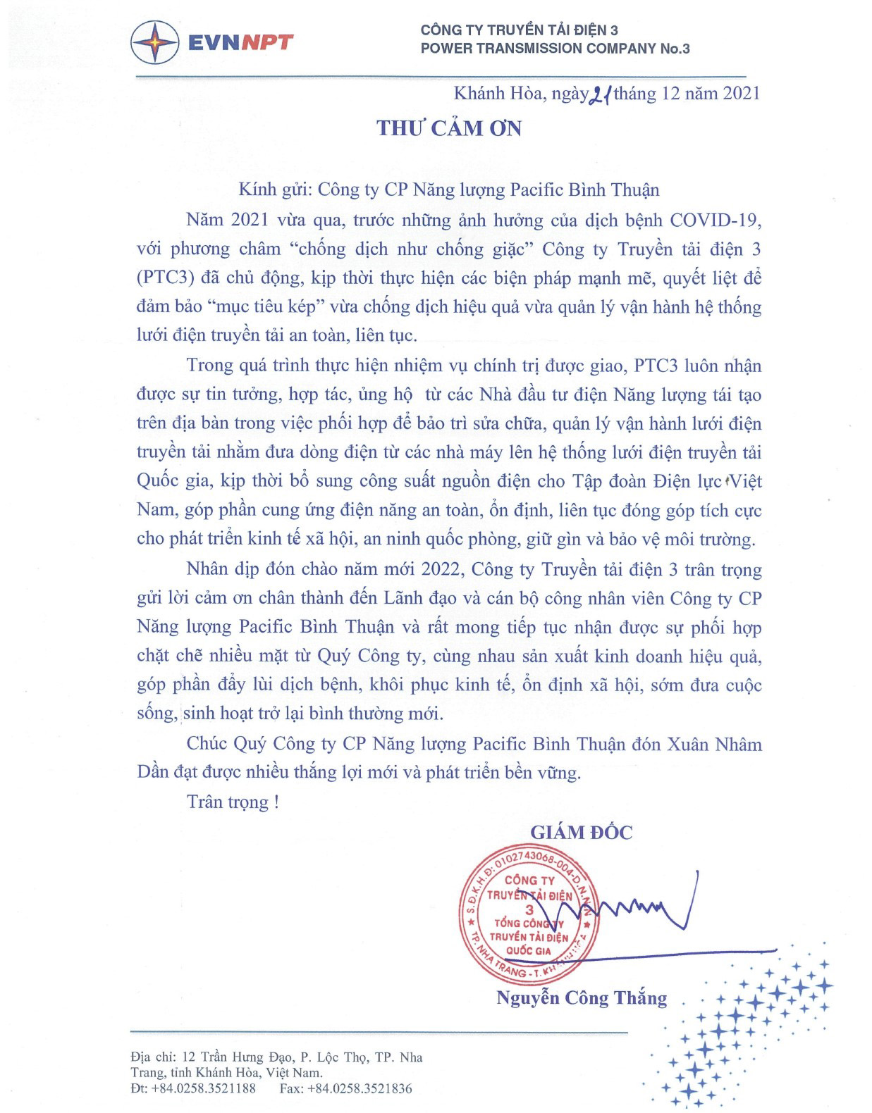 Thư cảm ơn của Công ty Truyền tải điện 3