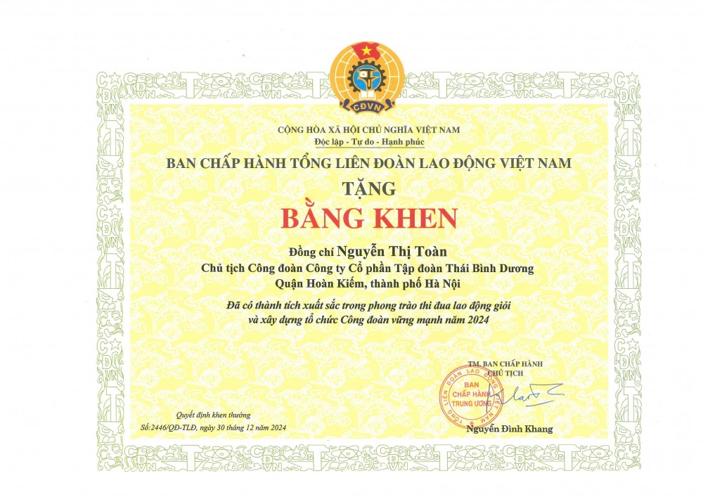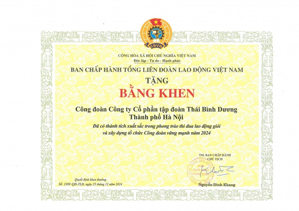 Bằng khen của Tổng LĐLĐ Việt Nam tặng Công đoàn Tập đoàn Thái Bình Dương