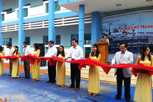 Ảnh 2: Ông Phan Văn Quý, Chủ tịch Tập đoàn Thái Bình Dương (đứng thứ 4 từ phải sang) cắt băng khánh thành Công trình cộng đồng phòng tránh thiên tai - Trường tiểu học Hàm Thắng 3, xã Hàm Thắng, huyện Hàm Thuận Bắc.