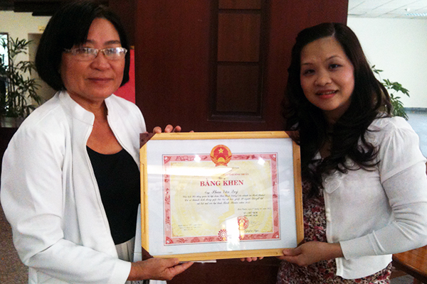 Ảnh 1: Bà Nguyễn Thị Toàn (bên phải) đại diện Tập đoàn Thái Bình Dương nhận Bằng khen của UBND tỉnh Bình Thuận tặng ông Phan Văn Quý, do Bà Nguyễn Thị Thanh Hải, Phó Chủ tịch Hội Bảo trợ Người khuyết tật và Trẻ mồ côi tỉnh Bình Thuận trao tặng.