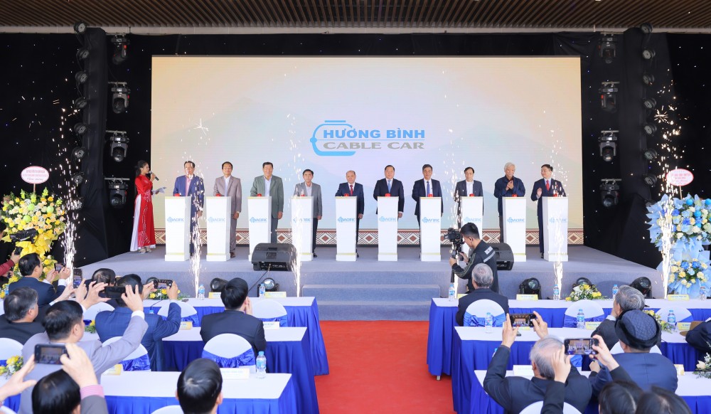 Lãnh đạo tỉnh cùng ban cố vấn dự án bấm nút khai trương dự án tuyến cáp treo Hương Bình