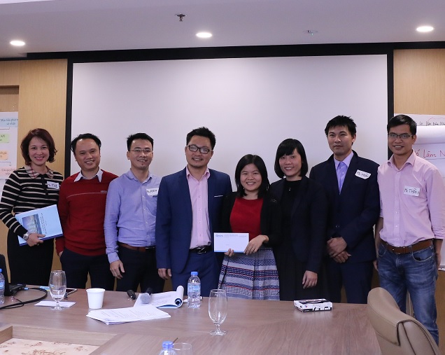 Phó Tổng Giám đốc Hồ Minh Ngọc (đứng thứ hai bìa trái ảnh) cùng cán bộ, nhân viên trong tổ học tập giành số điểm cao nhất trong buổi đào tạo và nhận quà từ giảng viên Phan Văn Sơn (đứng thứ ba từ bìa trái ảnh)